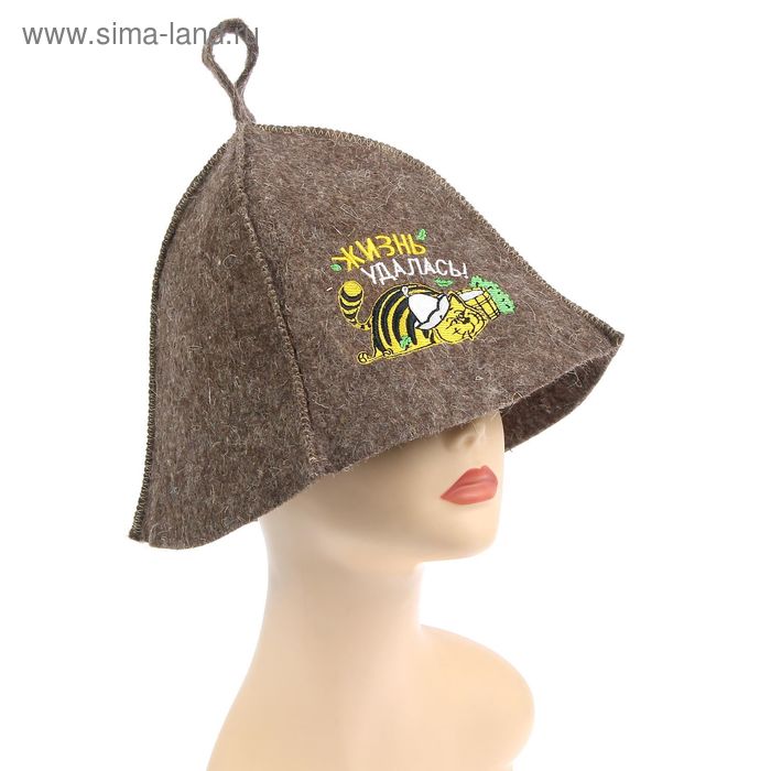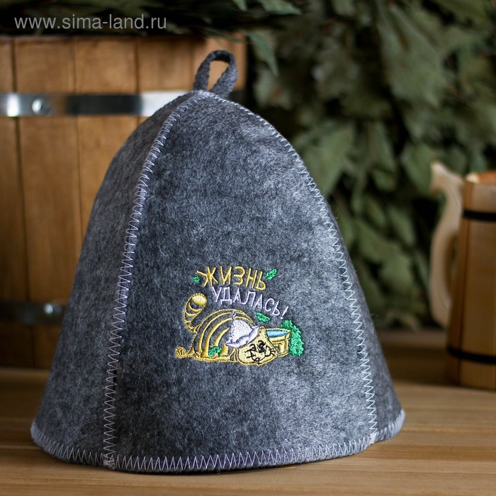 Шапка для бани с вышивкой из серого войлока "Жизнь Удалась"