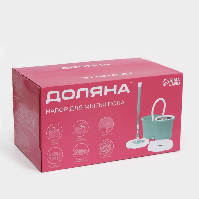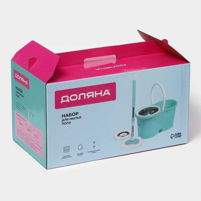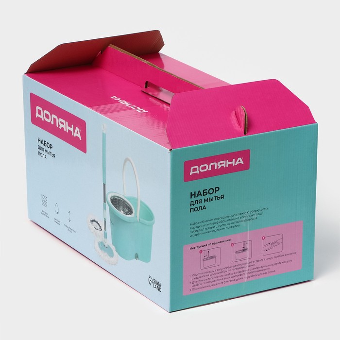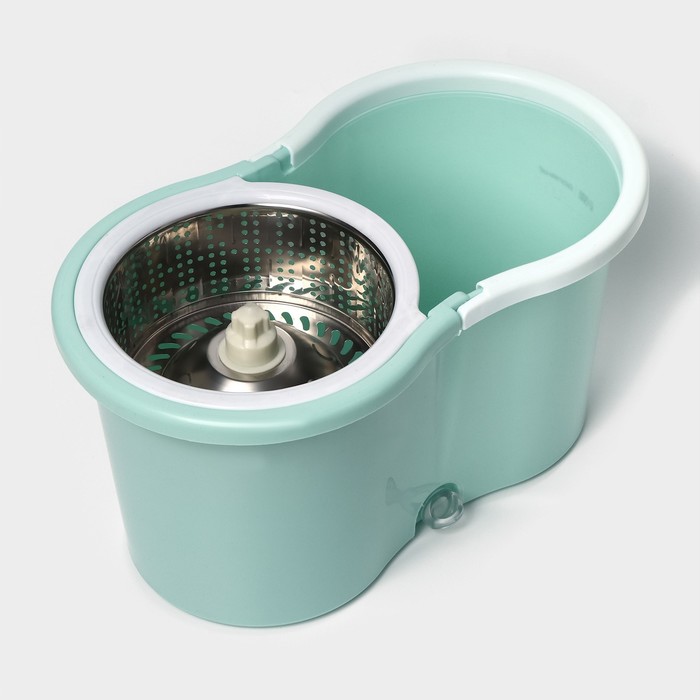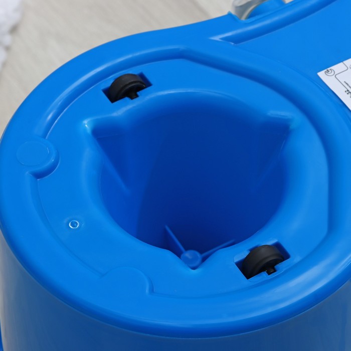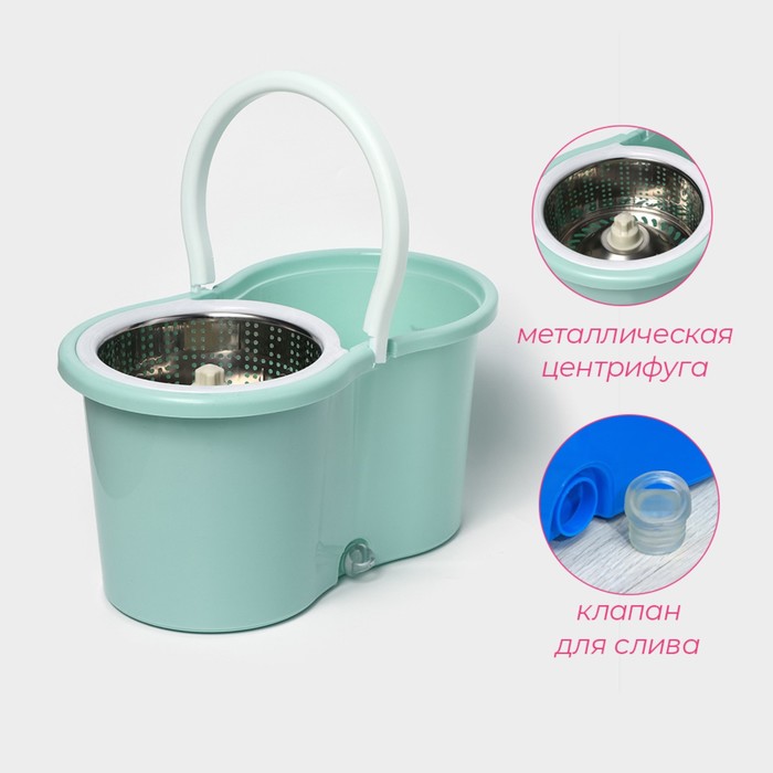 Ведро объемом 14 л позволяет забыть о необходимости наклоняться и пачкать руки в грязной воде. Подвижная часть ручки швабры легко опускается и обеспечивает вращение насадки как в отсеке для полоскания, так и в центрифуге для отжима. Вы без труда можете контролировать уровень влажности моющей части за счет количества вращений. Металлическая центрифуга отжима, более долговечна, чем пластиковая.