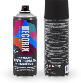Аэрозольная грунт-эмаль по ржавчине 3 в 1 Decorix (черный; глянцевый; 520 мл) 0106-01 DX предназначена для защитно-декоративного окрашивания заржавевших или подверженных коррозии поверхностей из сплавов чёрных металлов при бытовом применении, декоративно-оформительских работах, строительстве и ремонте. Подходит для окрашивания: древесины, пластика, металла, бетона, кирпича, керамики, стекла, картона и минеральных поверхностей.