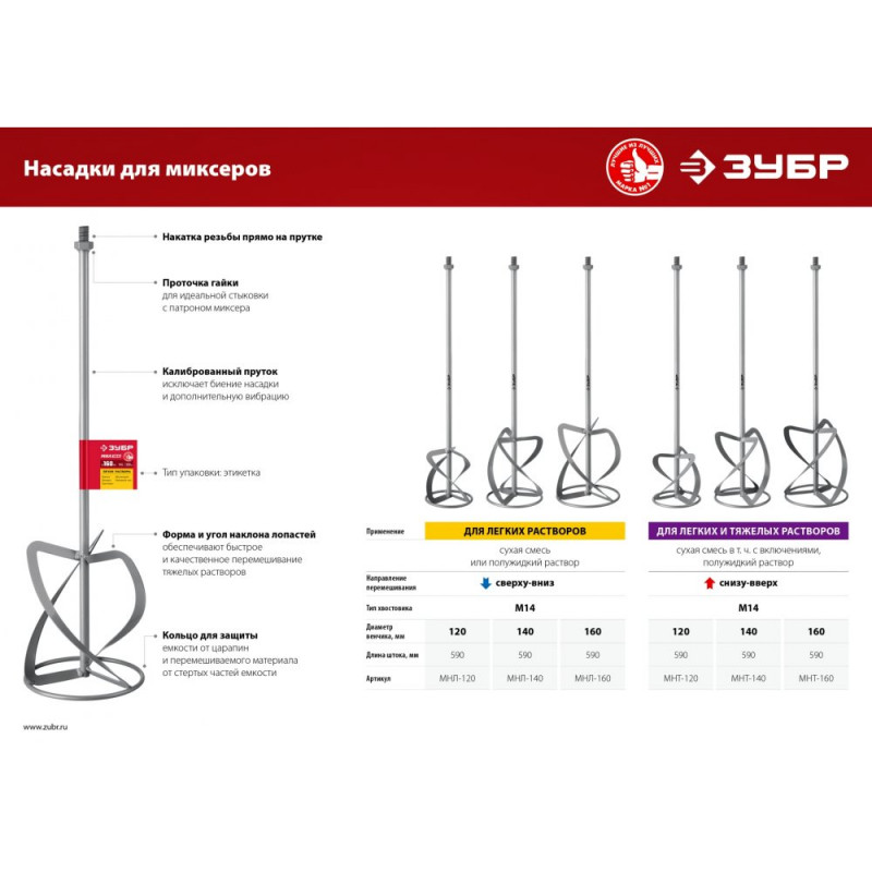 Для сохранения инструмента в рабочем состоянии, а так же предусмотренной гарантией завода изготовителя, наш интернет-магазин (zubr36.ru) рекомендует использовать ЗУБР М14, d120 мм, насадка-миксер для тяжелых растворов "снизу-вверх" (МНТ-120) строго по назначению.
